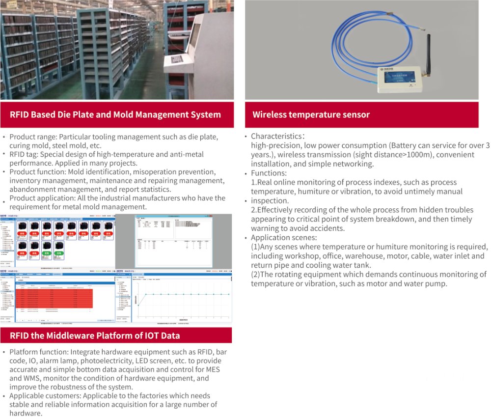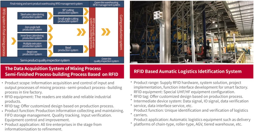 The system is mainly based on RFID automatic identification technology, which integrates various IOT technologies to realize the functions of processing information acquisition and control, material information acquisition and control, and warehousing and transportation information acquisition and control in tire production process, including data acquisition system of mixing process -- semi-finished process – building process based on RFID, automatic logistics identification system based on RFID, mold management system based on RFID, EPD, IOT platform and other major products.